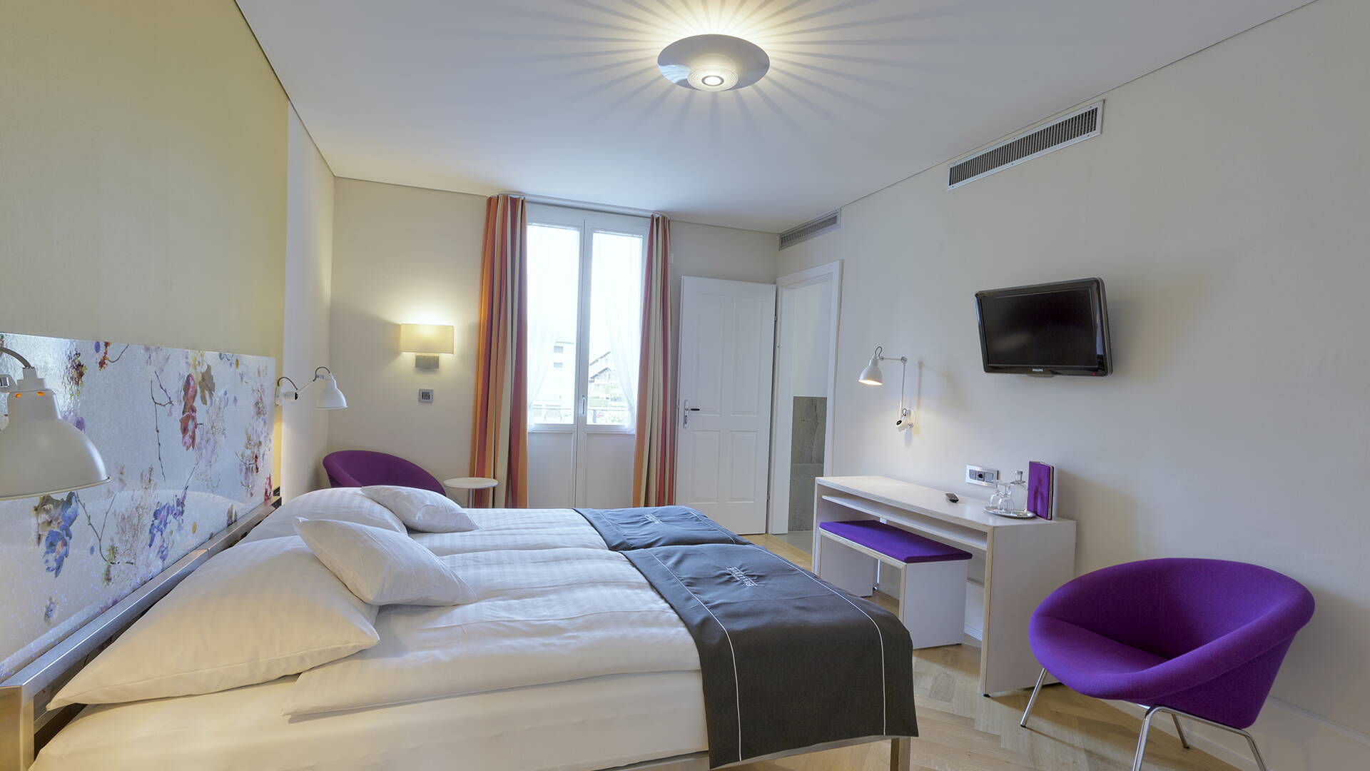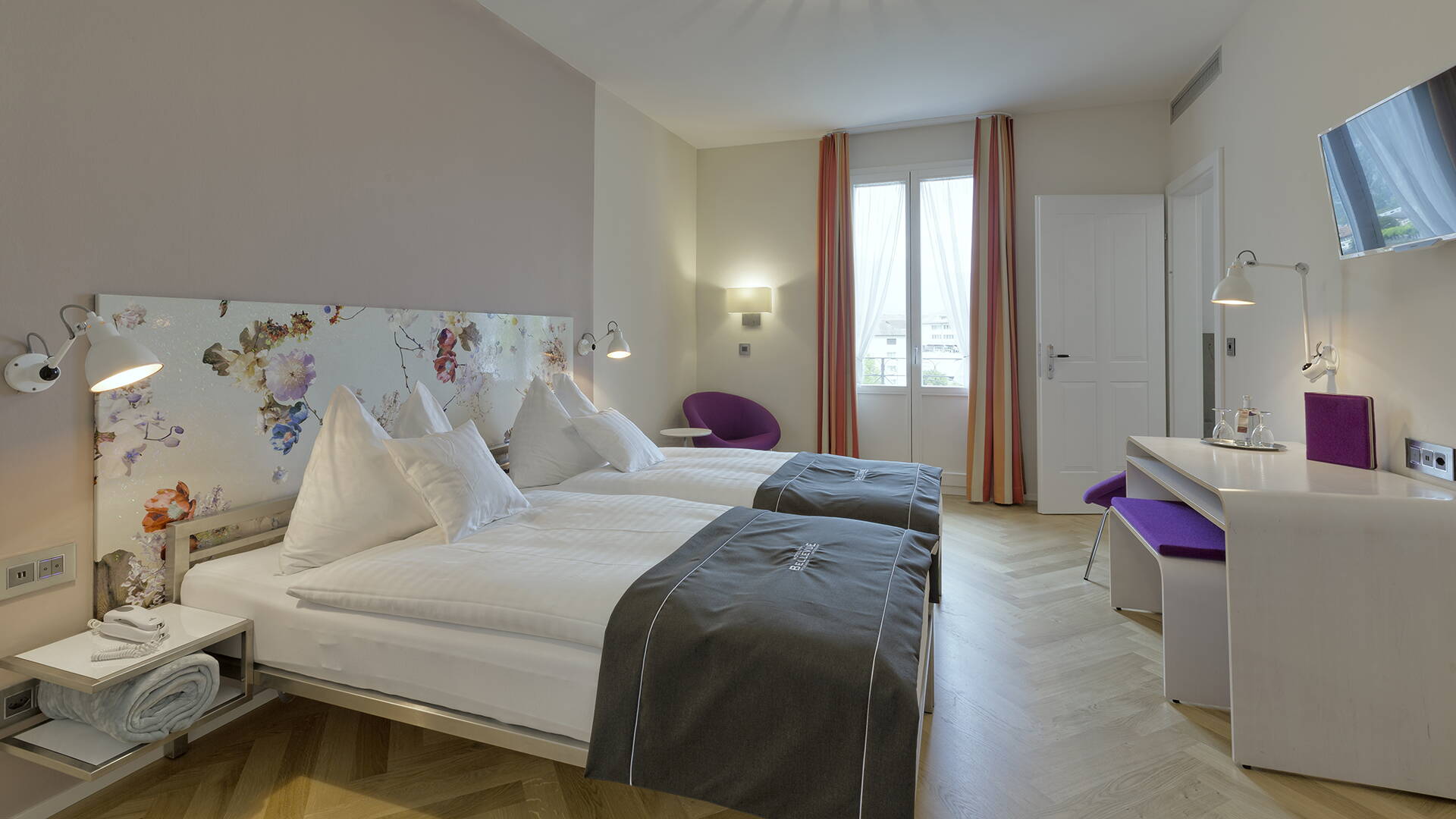 Die liebevoll renovierten Zimmer verfügen alle über einen Balkon mit herrlicher Sicht. Seit 2020 sind alle Zimmer mit individuell steuerbaren Klimaanlagen für höchsten Komfort ausgestattet.