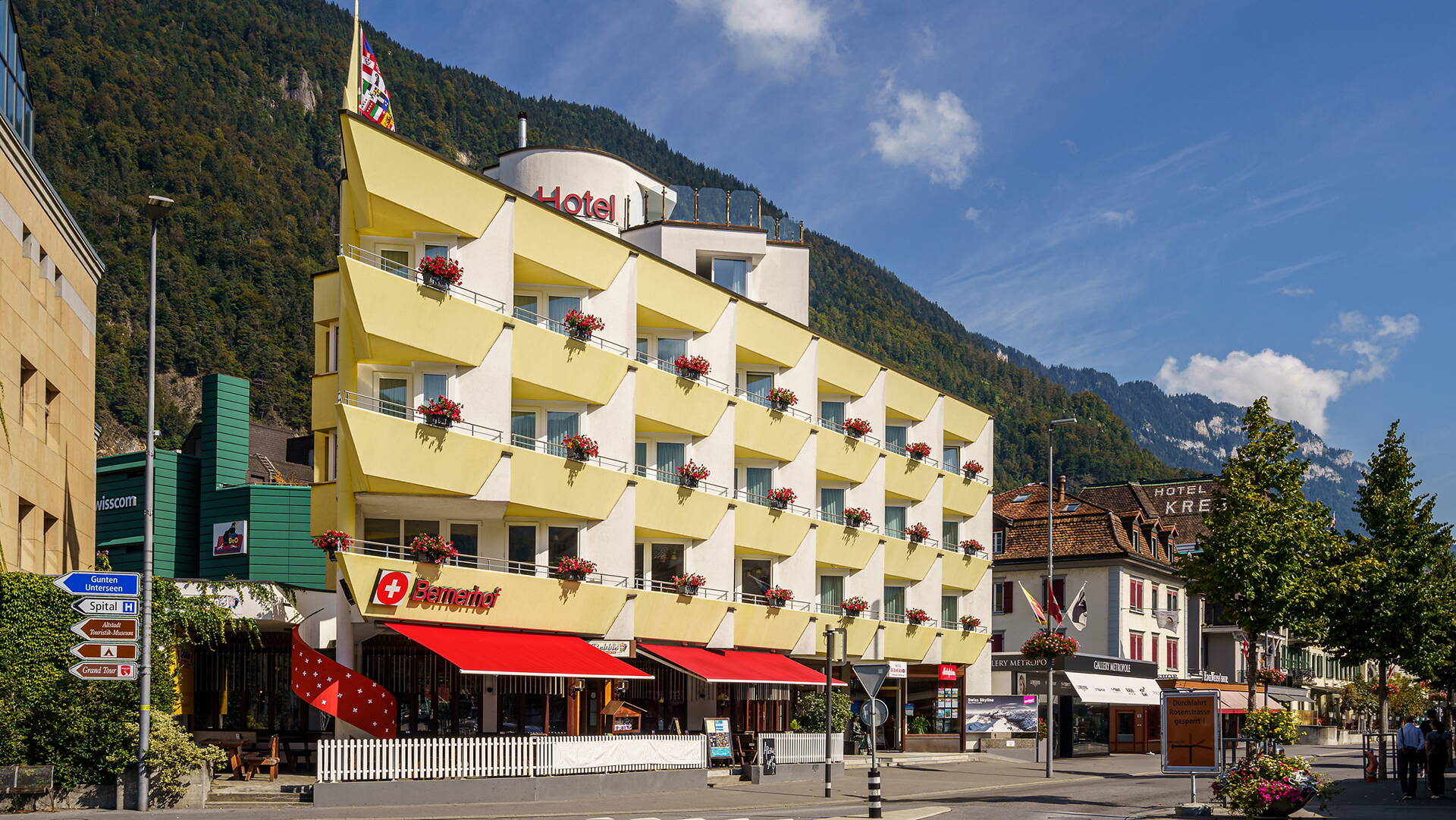 Der Bernerhof liegt direkt neben dem Bahnhof Interlaken West. Die bekannte Einkaufs- und Flaniermeile beginnt direkt vor dem Hoteleingang. Das Kongresszentrum befindet sich 7 Gehminuten vom Hotel entfernt.