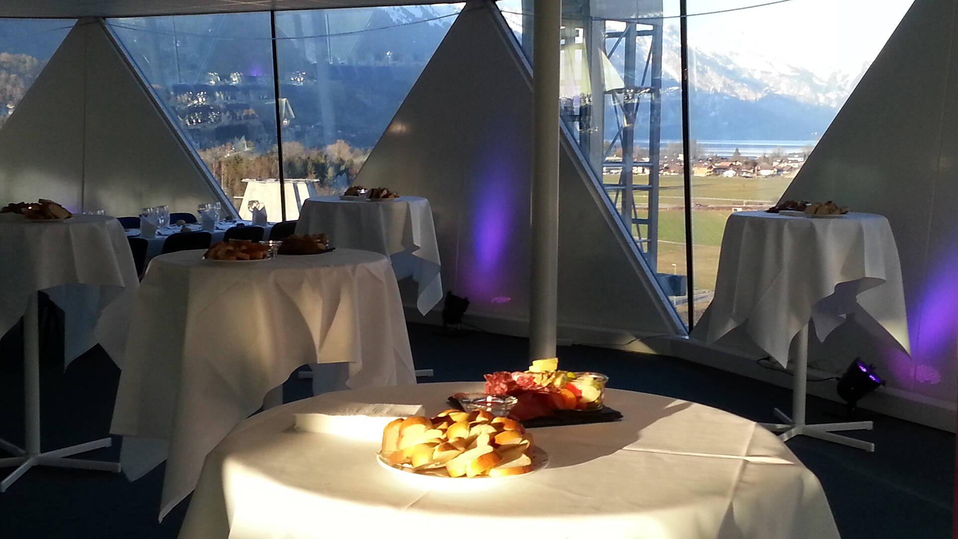 40m über dem Boden befinden sich im 7. und im 8. Stock der silbrigen Panoramakugel einzigartige Veranstaltungsräume. Gerade für Bankette und Apéros bieten die Räumlichkeiten eineinzigartiges Ambiente. Aber auch kleinere Seminare oder Workshop finden hier den passenden Rahmen.