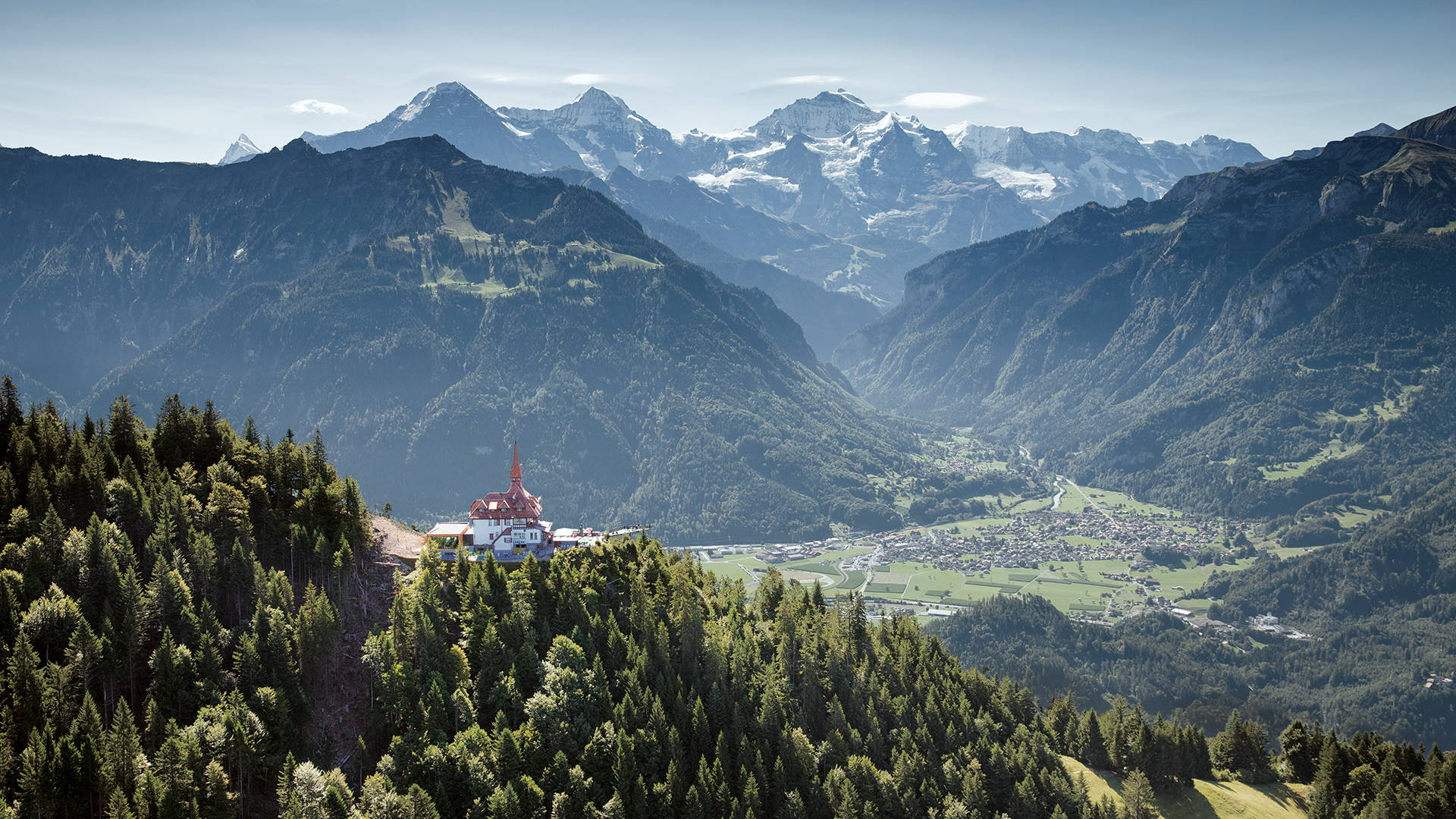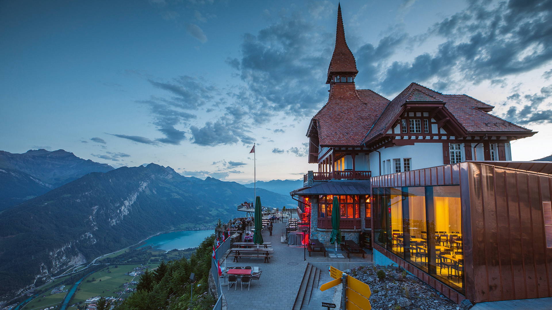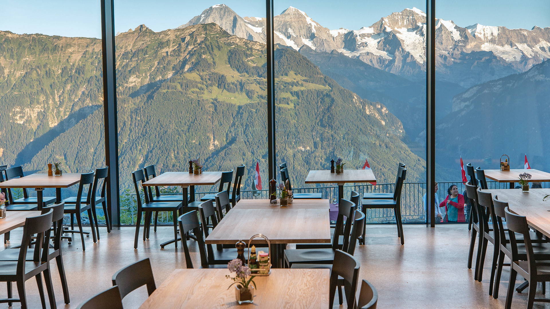 Oben angekommen eröffnet sich ein fantastischer Ausblick auf die beiden Seen und auf Eiger, Mönch und Jungfrau. Das Restaurant bietet drei verschiedene Räumlichkeiten. Der neu gebaute und im Jahr 2017 eröffnete Saal «Jungfrau» bietet im lichtdurchfluteten Raum Platz für bis zu 130 Gäste.
