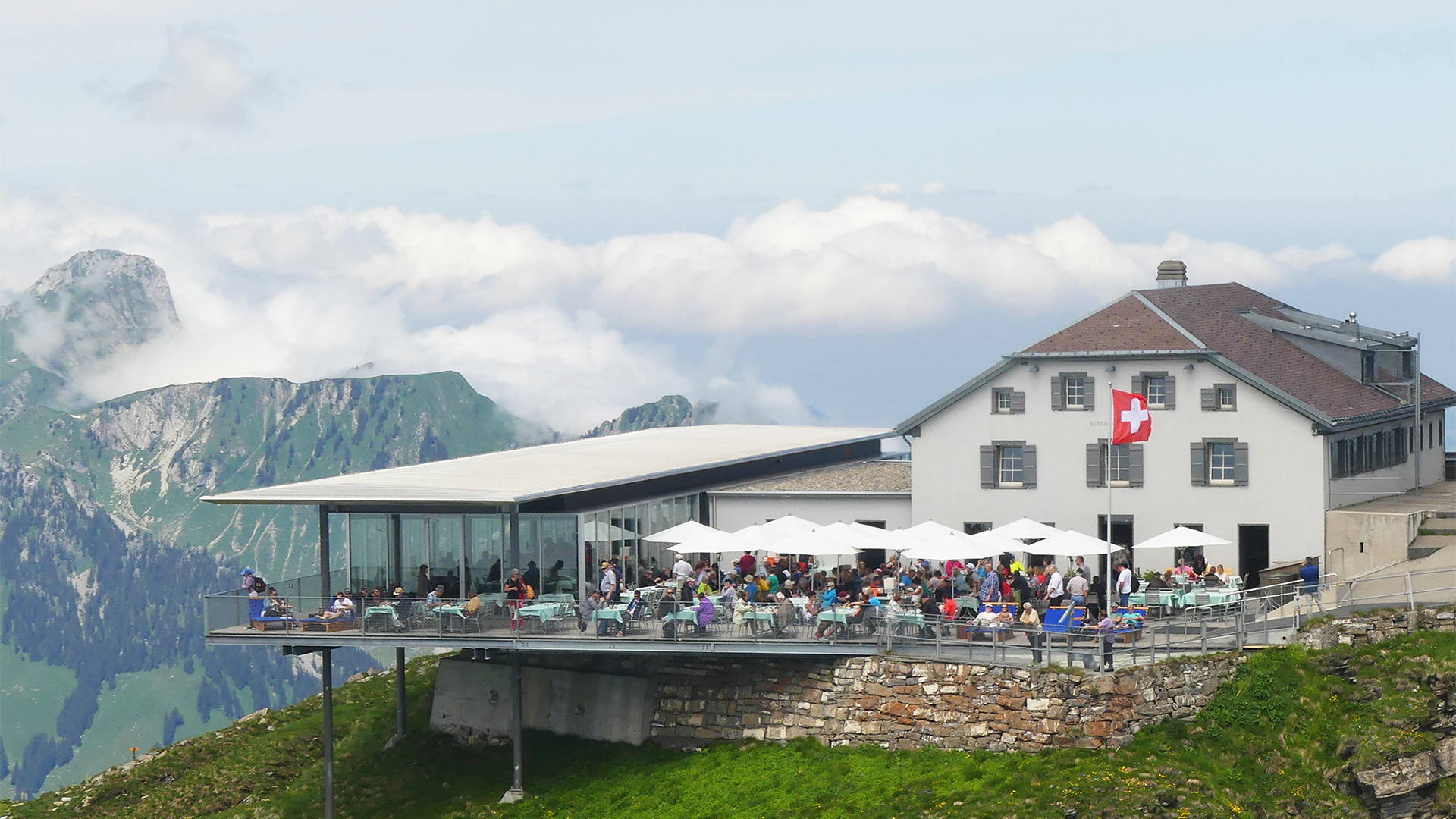 Anyone who appreciates a varied range of gastronomy with local products should definitely visit the Berghaus Niesen Kulm with its unique glass pavilion and large sun terrace. You can expect a wide range of offers from brunch to special theme buffets.