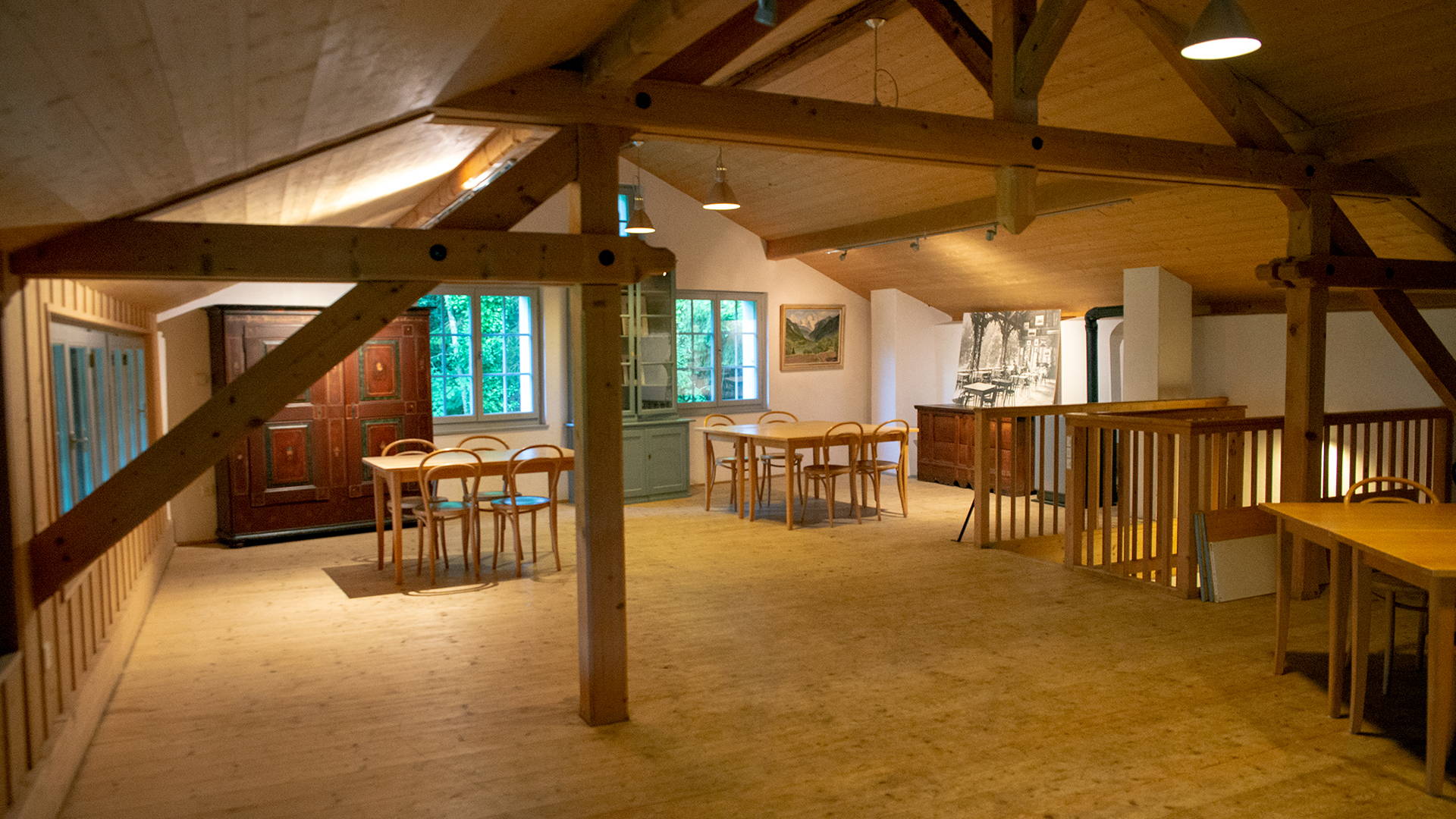 The Trinkhalle (beer hall) lies at the edge of the «Kleiner Rugen» Forest, just a few minutes outside of Interlaken. The unobstructed view of the bulk of the Jungfrau and the charm of the traditional rooms will also enchant you. The beer hall can be rented throughout the year. Three rooms are available: The open-plan beer hall with a direct view of the Jungfrau, the cosy, small Rappard Hall with an open fireplace, and the attic hall on the upper floor of the building.